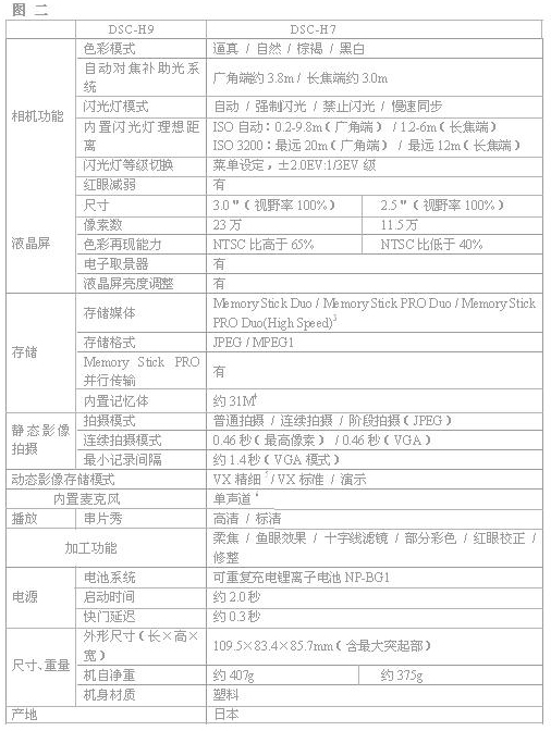 2007年3月7日---索尼Cyber-shot H系列大变焦数码相机一直备受准专业人士和高端家庭用户欢迎。此次,索尼(中国)有限公司再次发布两款新品——DSC-H9和DSC-H7。它们均持有1/2.5”810万有效像素“Super HAD”CCD、15倍光学变焦卡尔•蔡司“Vario-Tessar”镜头及Bionz影像处理器,焦距覆盖了从31mm广角到465mm超远望的所有焦段,擅长风光、人像、微距、体育等多种题材拍摄,让摄影爱好者能体验多种题材的拍摄乐趣。