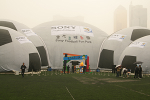 在现场记者看到,整个活动现场的主体是由5个巨大的充气式结构的“气罩”链接、构建而成的室内足球场,这在国外尚属罕见。据说这是目前全亚洲最大的“移动室内足球场”。