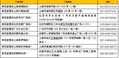 Sony Store索尼直营店(北京、上海、广州、成都)详细地址: