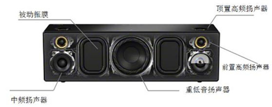 在整体结构上,X9采用7颗扬声器单元加2支被动振膜的设计。为了能够让用户有更为灵动的音乐体验,SRS-X9将自身音频单元进行高、中、低三频分割,从而获得出色的音域效果。在机身顶部和前方均配备两个高频扬声单元,而正前方更是采用了全新的中频磁流扬声器+重低音扬声器的组合,7颗独立单元的配置使X9几乎覆盖整个音域,再搭配154W 的机身最大輸出功率,兼顾音质与震撼力。