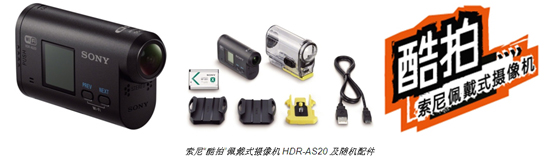 2014年8月7日,索尼(中国)有限公司推出入门级“酷拍”佩戴式高清摄像机HDR-AS20。大到播报FIFA世界杯赛事的专业4K摄像系统,小到可以戴在耳边的高清摄像机,凭借丰厚的专业积累,索尼驰骋影像市场各个领域,更在短短两年内推出四款“酷拍”,开创佩戴式摄像机市场的新格局。