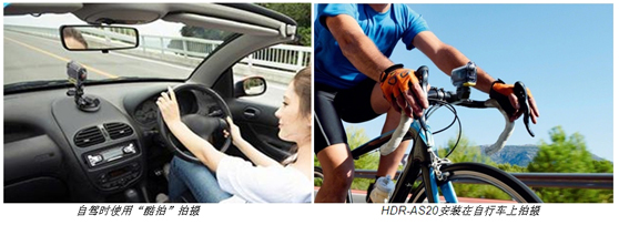 而对于越来越多的自驾游和骑行爱好者来说,解放双手、小巧优质的“酷拍”俨然是不可多得的“高级行车记录仪”。HDR-AS20虽然定位入门级,但品质、性能以及配件等均保持了“酷拍”系列摄像机一贯的高水准:它流线设计风阻较小,非常适合骑行或自驾;新品套装依然采用可实现5米防水的SPK-AS2防水外壳;拥有约1680万像素的Exmor R CMOS影像传感器,170度大广角蔡司® Tessar®镜头,可拍摄最高1920x1080/50p的优质高清视频;索尼出色的防抖技术又让“酷拍”成为无数玩家心中优质稳定影像的代名词。路途崎岖,有可以信赖的HDR-AS20,骑行、自驾画面更流畅。