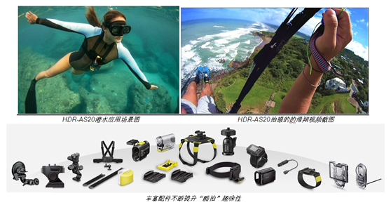 索尼“酷拍”摄像机,小巧轻便,配件群丰富:结合随机的5米防水壳或60米深水防水壳、头戴式或胸戴式配件,即可在潜水、冲浪或者滑雪时固定耳朵边或绑在胸前,轻松捕捉各种独特视角;翱翔蓝天,俯瞰大地时,如果使用腕带配件或自拍杆,170度广角则可以将自己的表情与天地间美景融为一体……用“酷拍”拍摄可以解放双手、尽情拥抱大自然而不必为拍摄操心,既不错过震慑人心的当下感受,又可轻松记录、分享回味。