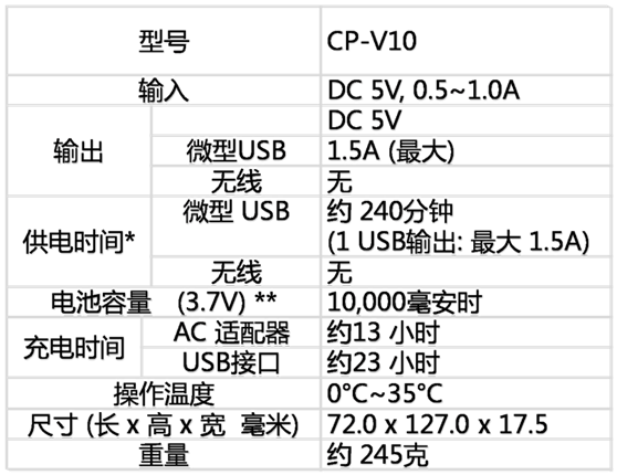 重约245克,CP-V10电源具有轻便的塑料机身,4个LED电量指示灯,让您知道有多少剩余电量,开关键可以避免意外的放电。基于索尼混合凝胶技术,CP-V10包含索尼原装聚合物锂离子电池, 在充放电1000次后,依然能够保持90%以上可用容量,用电脑USB接口或AC适配器2都能为它充电。