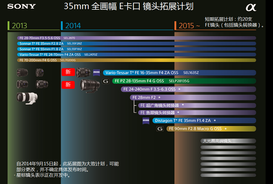 此外,索尼还公布了新的全画幅FE卡口镜头拓展计划,预计在2015年3月之前再发布4款全画幅镜头和2款镜头转换器。分别是具备F1.4大光圈的蔡司人文视角镜头Distagon T* FE 35mm F1.4 ZA;索尼大变焦镜头FE 24-240mm F3.5-6.3 OSS;索尼G系列微距镜头FE 90mm F2.8 Macro G OSS;索尼广角定焦镜头FE 28mm F2,以及与之组合的鱼眼镜头转换器(等效35mm画幅16mm)和超广角镜头转换器(等效35mm画幅21mm)。届时索尼全画幅FE卡口的镜头数量将达到13款(包括镜头转换器),而到2015年底,索尼FE卡口镜头的数量将多达20款,满足不同用户和不同拍摄题材的需求。