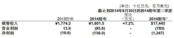 2014财年第二季度,索尼公司销售收入与上年同比增长7.2%,为19,015亿日元(174.45亿美元)。销售收入增长的主要原因是:PS4带来的游戏和网络服务业务 (G&NS) 的显著增长,部件业务中影像传感器等产品的显著增长,以及汇率利好影响。同时,个人电脑业务的退出对营业收入有部分减少影响。