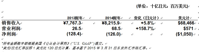 东京2015年4月30日 -- 索尼公司(下称索尼)今日公布2014财年(截至2015年3月31日结束)整体业绩数字,如下: