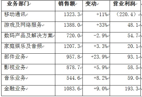 2014财年,索尼集团营业利润比上年增加421亿日元,达到685亿日元(5.71亿美元)。造就这一显著增长的因素包括:部件业务、游戏与网络服务业务、以及家庭娱乐与音频业务运营数字的大幅提高。营业利润的改善一定程序上受到移动通讯业务的负面抵销,主要是第二季度计入的一笔1760亿日元(14.67亿美元)的商誉减值。下图为2014财年索尼各业务部门销售及利润情况(单位:十亿日元):