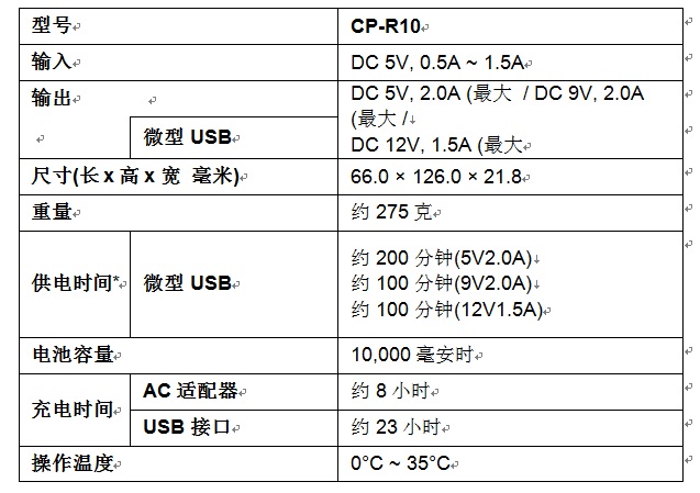 融合Qualcomm Quick Charge 2.0技术, 现在始终在移动中的用户可以为兼容设备使用超快充电2功能。对于设备不兼容的用户,CP-R10也能够用它5V 2.0A的输出为您的设备充电。此款移动电源10000毫安时的高电力容量可以在电量用完之前为您的智能手机充电高达4次3。您可以选择通过USB接口在AC适配器或电脑上为移动电源充电。