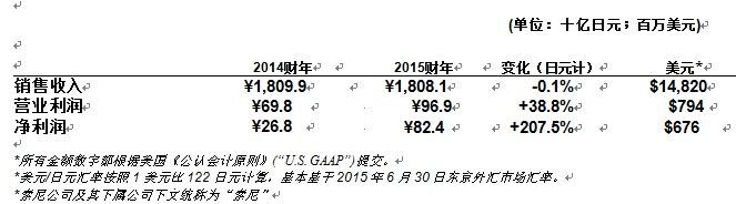 东京2015年7月30日 -- 索尼公司(下称索尼)今日公布2015财年第一季度(2015年4月1日至6月30日)业绩数字,如下: