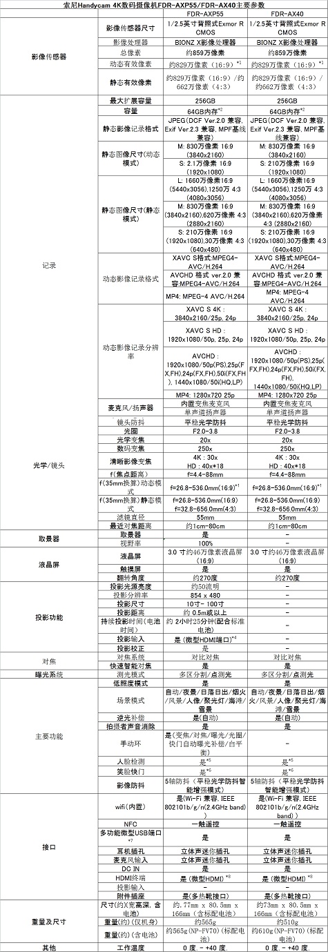 2016年2月16日,索尼(中国)正式发布4K数码摄像机FDR-AXP55以及FDR-AX40。用索尼4K摄像机记录孩子的成长、通过4K电视与全家分享,已经成为许多家庭共享亲子时光的首选方式。索尼4K摄像机FDR-AXP55以及FDR-AX40的发布,使4K离普通家庭更近了一步: 强大的5轴防抖功能可以补偿移动拍摄时来自多方向的抖动,哪怕没有经验的新手也能拍出稳定的画面。新品的变焦倍率提升至约20倍,结合新加入的快速智能自动对焦系统,当“熊孩子”们沉浸在玩乐世界不亦乐乎时,不用跑前跑后跟拍即可通过变焦轻松捕捉每段精彩。索尼4K摄像机FDR-AXP55以及FDR-AX40机身自带的一键编辑,可将拍摄的内容自动合成一条精彩短片。AXP55内置约50流明的投影模块, 令视频分享更便捷有趣。从高清到4K, 从普通防抖到5轴防抖, Handycam的每次革新进取,都是为了呵护您每一段宝贵的记忆、让栩栩如生的影像留存快乐的原味。