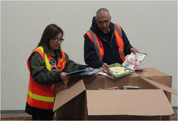 索尼电子美国公司员工正在对收集到的图书分类排序
