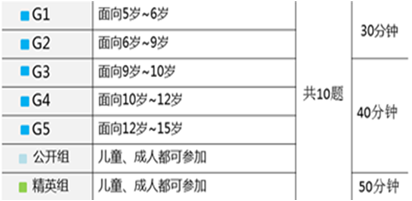 组别:G1~G5(小学一年级至初中三年级)/公开组(无年龄限制)/精英组(无年龄限制)