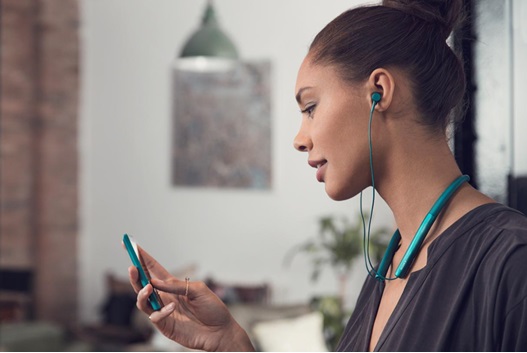 入耳式无线索尼耳机h.ear in Wireless(MDR-EX750BT)采用颈挂式设计,流畅的线条和时尚色彩传达鲜明的个性风格。纤巧的机体与颈部高度锲合,大幅度提升佩戴舒适度以延长佩戴时间。颈部采用的弹性橡胶材质,有效防止滑落,为用户提供日常持久陪伴。
