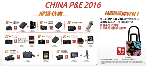 “以旧换新”服务将会伴随着China P&E 2016展会于4月22日正式开始,届时有意向更换或者购买索尼最新影像产品的用户可以到索尼的经销商*3展台,亲手体验一下各种方便实用的黑科技产品,活动持续到4月25日结束,为期4天。具体活动流程是:用户携带自己想要置换的数码影像产品到索尼经销商展台,索尼经销商通过专业现场评估给出置换价格,如双方达成一致后确认成交,经销商现场支付顾客置换的金额。凡是在China P&E 2016参加“以旧换新”活动的用户,将会获得索尼20周年精美礼品一份(礼品袋及徽章)。