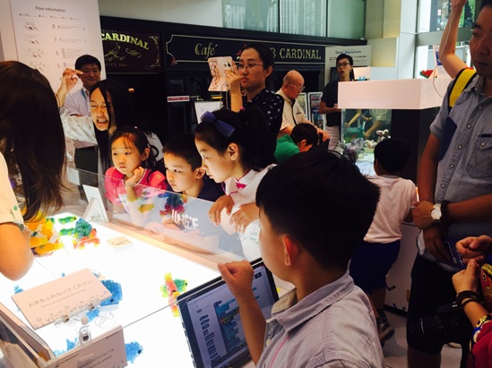 随后,代表团来到索尼大厦,这里正在举办为纪念索尼银座大厦成立50周年而设立的“索尼水族馆”展览活动。意想不到的是,索尼国际教育的另一个明星产品、预计于今秋上市的KOOV教育机器人套件(下称KOOV)也来到了现场。KOOV代表的是索尼国际教育公司在培养“创造”能力方面的产品,旨在培养孩子们的动手动脑、建模编程等综合创新能力。通过不同拼接,KOOV可以更换造型,改变成任何你想要的形状。今天,孩子们在这里看到了“螃蟹”及其他海洋生物形状的KOOV,争先恐后地装拆并与其互动。正如今天的主题“水族馆”,KOOV是索尼产品宽广海洋中重要的一个组成,与其它产品一同推波助澜,为使用者带来超凡的“感动”体验。
