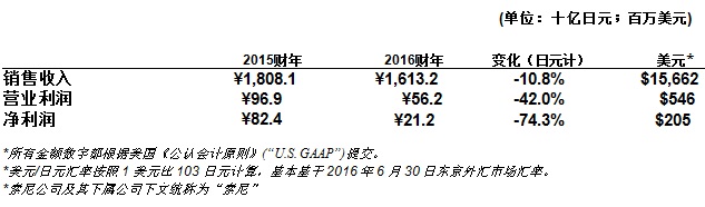 东京2016年7月29日 -- 索尼公司(下称索尼)今日公布2016财年第一季度(2016年4月1日至6月30日)业绩数字,如下: