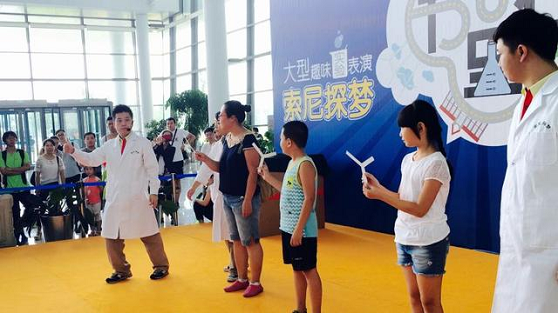 “索尼探梦”科技馆的经典节目“大型室内精品实验表演”汇集了索尼探梦最受欢迎的科学实验。在现场,索尼探梦的实验人员把纸片做成的“飞去来器”扔出去并使它神奇地旋转飞回手中,让沉甸甸的保龄球在空中“飘浮”,而“氦气使声音产生的奇妙变化”、“空气炮带来的巨大威力”等异常精彩的科普表演更引起了孩子们的阵阵掌声。“在活动中,索尼探梦实验人员为科学实验插上了想象的翅膀,以生活中简单易得的素材,巧妙地融合了知识和趣味,进行各类花样翻新的实验表演,让孩子们在趣味体验中潜移默化地掌握科学知识。