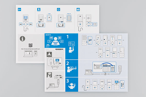 过去销售往世界各地的产品,其使用手册因为包括了我们不需要的语言,往往很容易被丢弃浪费。如今,随身听和头戴式耳机的使用指南采用图绘的方式(代替文字)更直接地描绘基本操作从而节约了资源。取消了多语种的文字产品使用手册后,图绘产品手册的使用在这些类别产品在2015年的用纸量比上一年削减了23.8%:相当于几乎16.7吨纸张。这种高效的文件制作方式还使得包装更小更轻便,有利于抑制了物流过程中二氧化碳的排放。这种非文本方法获得2015年日本优良设计奖。