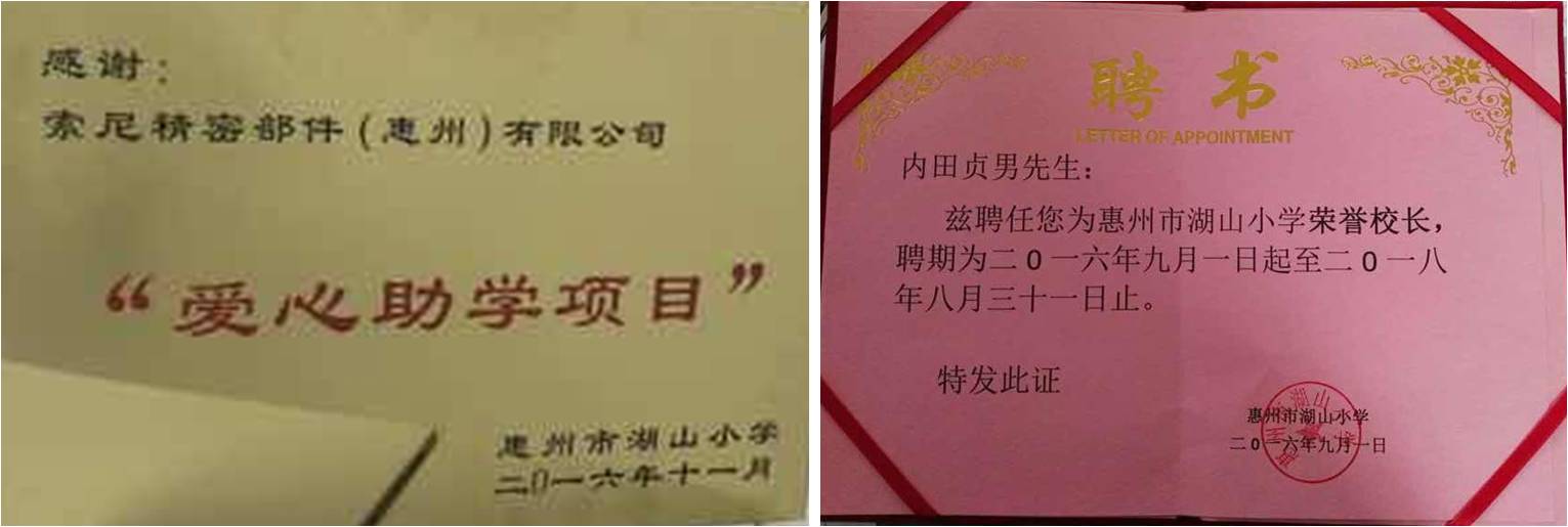 湖山小学的校方领导对此次活动表达了热烈的欢迎和诚挚的感谢。聘请SPDH业务企画部门内田贞男部门长为湖山小学的“荣誉校长”,并赠送SPDH“爱心助学项目”牌匾表达感谢。