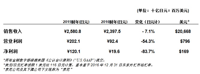 2016财年第三季度,索尼公司销售收入与上年同比下降7.1%,为23,975亿日元(206.68亿美元)。销售收入下降主要受到汇率的消极影响。按恒定货币计算,本财季销售收入同比基本持平,其中游戏及网络业务和半导体业务销售收入显著增长。营业利润方面,本财年第三季度营业利润为924亿日元(7.96亿美元)。营业利润同比下降的主要原因是:影视业务录入了1,121亿日元(9.62亿美元)非现金性的商誉减值。