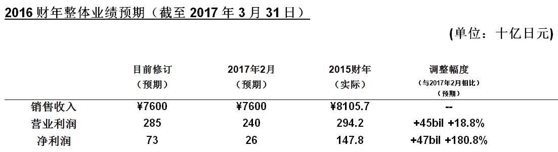 *2017年2月2日发布的业绩预期数字,汇率按照2016财年第四财季(2017年1月1日至2017年3月31日)预期汇率约1美元比118日元计算。实际平均汇率为1美元比113.7日元。