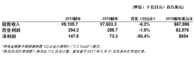 东京2017年4月28日 -- 索尼公司(下称索尼)今日公布2016财年(2016年4月1日至2017年3月31日)整体业绩数字,如下: