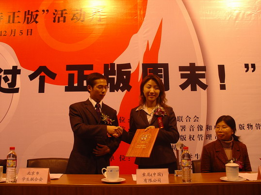 为了促进我国音像事业更加健康地发展,不断向大学生宣传、普及知识产权相关法律知识,提高版权保护意识,“让我们过个正版周末”——北京高校2005 Sony“支持正版”活动月开幕式于2005年11月7日在北京师范大学英东学术会堂举行。北京市学生联合会、共青团北京市委员会、新闻出版总署、国家版权局、中国音像协会、北京师范大学及索尼(中国)有限公司等相关部门领导出席了本次开幕式。