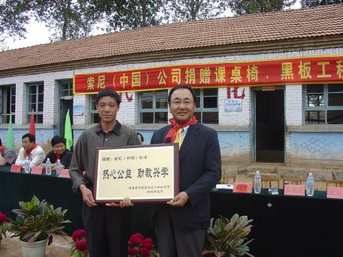 2005年9月15日,索尼(中国)有限公司副董事长兼总裁川崎成一先生、以及中国青少年发展基金会、河北省青基会、河北省平泉县相关领导将一批崭新的黑板和课桌椅送到河北省平泉显党坝镇大吉口中心小学,并出席了“索尼爱心助学工程”的捐赠仪式。同时,为了增强员工对索尼集团“以技术贡献社会,做优秀企业公民”理念的认知,鼓励索尼员工积极参与公益事业,川崎先生在索尼(中国)有限公司内部号召员工积极参与公益活动、奉献索尼爱心,通过员工的亲身参与将公司“致力于做优秀企业公民”的企业发展理念深入执行下去。9月12日-15日期间,索尼(中国)有限公司位于哈尔滨、长春、乌鲁木齐、兰州、贵阳、长沙的分公司和办事处的负责人分别走访了当地的受捐助小学,实地考察了贫困地区小学的实际教学环境、了解当地民情,与小学生面对面的进行交流,把代表索尼爱心的“索尼爱心助学捐赠牌”交给当地孩子们的手中。