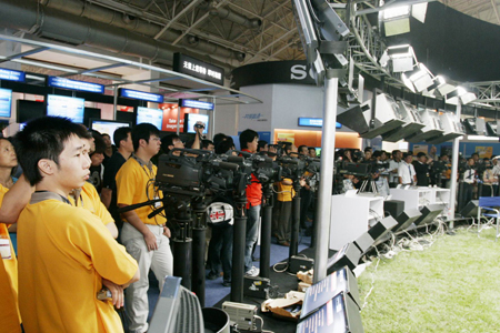 在“节目制作应用”区域,观众可以看到新型数字电影摄像机。高端的HDCAM-SR系列产品将展示全新的镶挂式电影摄影机设计,实现RGB4:4:4(最高30P)、从1到60P的可变帧强大拍摄能力;支持多格式1080/1-60P,50i,60i;以及14-bit转换器。为高端数字电影拍摄提供有力保障。而为24P主流高清制作提供新选择的全新数字高清摄录一体机HDW-F900R,比以往广受赞誉的HDW-F900功能更加强大。作为后者的升级型号,HDW-F900R进一步增强了方便性、灵活性和实用性,必将继续成为全球拍摄黄金时段电视情景剧以及电视连续剧的首选。Sony即将推出的高清演播室录像机HDW-D1800/1800,其概念和技术核心部分也在本次展会上与大家见面。