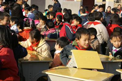 十一月二十三日,安徽大别山老区的汤家汇镇泗河中心小学,在初冬寒冷的空气里传来阵阵鞭炮响和欢笑声。全校师生正在兴高采烈地将使用了多年的破旧桌椅、黑板搬出教室,将数百套新购的课桌椅及黑板搬进课堂!旋即,整修一新的教室里传来朗朗的读书声;操场上,山里的孩子第一次穿起运动服,开始了一场激烈的“七人制”足球对抗赛。