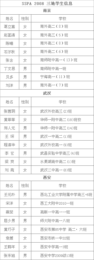 5月20日,中华全国青年联合会(以下简称“全国青联”)与索尼公司联合举办的2008年度“索尼海外学生交流计划” (Sony Student Project Abroad(China)---SSPA(China))赴日中国学生选拔活动正式落下帷幕。本次活动以“小镜头•大发现——探寻交流足迹,共建绿色家园”为主题进行了笔试作品征集,共收到来自西安、武汉、南京三大赛区的符合标准的作品276份,其中包括了作文、议论短文、以及突出中国传统文化的摄影和绘画等多种形式的作品。三地共有50名优秀中学生获得了现场面试资格,在经过评委会的选拔评议之后,最终24名学生脱颖而出,获得了今年7月底赴日交流的资格。(名单详见表格)