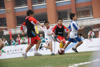 镜头1:来自广州市32所小学的小球员们在“索尼足球乐园-玩转世界杯活动”中进行激烈的5人制足球对抗赛。