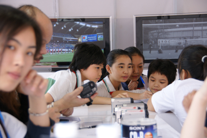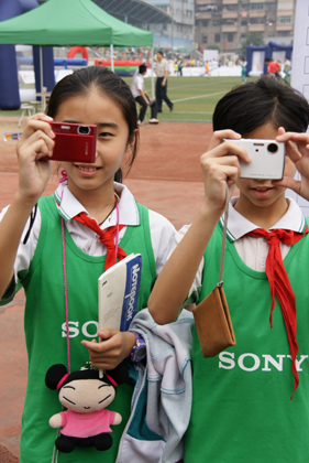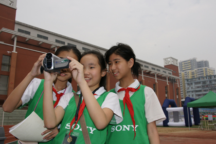 镜头3:索尼足球乐园活动中,同学们学者拿起摄像机和照相机,开心的体验着、记录着自己和同伴们的快乐瞬间。利用数码技术记录还原足球运动的精神实质和独特魅力成为此次足球草根活动的一大亮点。