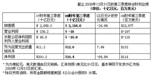 本季度财报显示,08财年第三季度销售收入为21,546亿日元,与上年同期相比下降24.6%,造成业绩下滑的主要原因是日元大幅升值。在截止至2008年12月31日的08财年第三季度中,日元的平均汇率为1美元比95.3日元、1欧元比125.2日元,与上年同期相比日元分别升值17.7%和29.6%。本季度如果按当地货币计算,销售收入同比下降9%。