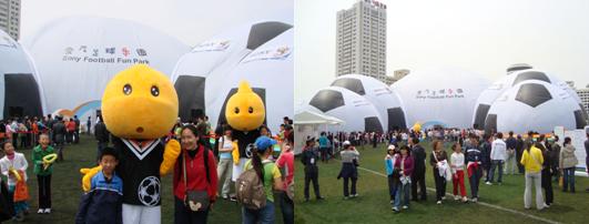 “索尼足球乐园”的活动现场主体是由5个巨大的充气式结构的“气罩”链接、构建而成的室内足球场,据悉这是目前全亚洲最大的“移动室内足球场”。到了晚上,绚丽的彩灯从“气罩”内部透射出来,为孩子们营造出一个如梦似真的梦幻乐园,也为青岛市的夜景平添了一份亮丽的色彩。