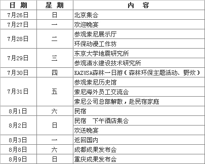 据悉,在本次由全国青联和索尼公司共同主办的“索尼海外学生交流计划”活动中,主办方为高中生们安排的活动行程内容丰富、全面且充实,他们将与日本高中生一起就环保、可持续发展问题进行深入地交流。在索尼日,同学们将利用索尼影像产品亲身参与环保动画制作,并将参观索尼相关设施,了解索尼公司60年来积累的科技环保成果;在地球日,他们将参观东京大学地震研究所、了解地球为什么是一个不断运动的生命体,这个生命体有哪些特征,并系统的学习抗震防灾知识;在高中生交流日,学生们将和日本高中生一道在野外体验和谐自然,和谐环境的重要性,学习善待环境的生活方式;在民宿体验日,高中生们将在日本的家庭中生活,真正零距离地体验日本文化。索尼公司对中国高中生的到访高度重视,索尼公司董事长、总裁兼CEO霍华德•斯金格先生及副董事长中钵良治先生,索尼(中国)有限公司董事长久保田阳先生会将举行隆重的欢迎晚宴,亲自接见到访的30名中国高中生,并和同学们进行亲切交流。