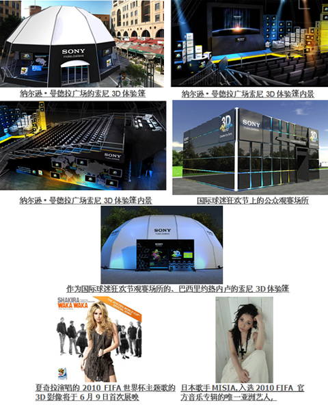 在这些“索尼3D体验篷”中,参观者将可以第一次看到2010FIFA世界杯25场比赛的3D影像集锦。这些3D世界杯影像将由索尼影视家庭娱乐部门制作成3D Blu-ray DiscTM光碟并发行。