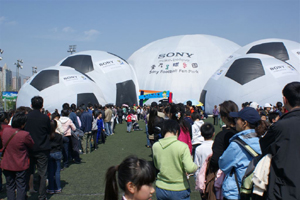 在现场记者看到,整个活动现场的主体是由5个巨大的充气式结构的“气罩”链接、构建而成的室内足球场,这在国外尚属罕见。据说这是目前全亚洲最大的“移动室内足球场”。