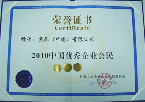 11月27日,“2010第六届中国企业公民论坛暨优秀企业公民颁奖盛典”在北京人民大会堂隆重开幕。十届全国人大常委会副委员长、企业公民委员会名誉会长顾秀莲出席大会并致辞,民政部、国务院国资委、国家发改委、全国工商联、中国红十字会、中国房地产业协会、中国供排水协会等单位的相关领导,和300多位企业领袖和相关负责人出席大会。大会公布了“2010中国优秀企业公民”调查评选结果,索尼(中国)公司荣获“2010第六届中国优秀企业公民奖”。