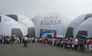 在现场记者看到,整个活动现场的主体是由5个巨大的充气式结构的“气罩”链接、构建而成的室内足球场,这在国外尚属罕见。据说这是目前全亚洲最大的“移动室内足球场”。