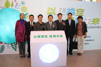 2011年11月10日上午10:20,“以废换宝 绿意未来”电子废弃物兑换礼品活动开幕式首先在天河城购物中心1层北大堂举办。开幕式上环境保护部宣传教育中心副主任何家振先生为活动进行了开场致辞,他在致辞中提到,环保是重大的民生问题,是全社会的事业,事关子孙后代的生存发展。环境保护既是责任也是义务;随后广东省环保宣教中心副主任周观明先生也就广东地区的电子废弃物回收再利用情况进行了介绍;此外,开幕式上索尼(中国)有限公司对外事务部总监吴克安先生还介绍了索尼(中国)有限公司主办此次活动的目的以及索尼集团“环境零负荷”「Road to Zero」(注)的环境计划,即:索尼集团力求在自身的事业活动及产品的整个生命周期范围内,于2050年达成“环境零负荷”的长期愿景。此计划不仅针对气候变化,还涵盖了资源循环、化学物质管理、生物多样性,描绘了如何在这4个环境领域实现“环境零负荷”综合蓝图。最后,大力支持本次活动的上海新金桥环保有限公司副总经理沈燕军先生也从回收、处理电子废弃物专业机构的角度,展望了电子废弃物处理的未来趋势以及对本次活动的期望。随后,四位嘉宾共同上台,分别将电子废弃物的模型投入了启动台,共同按下了此次活动的启动按钮,此时镶嵌在启动台上的地球以及背景板中绿色地球的图案同时亮起!承载着各方嘉宾共同的期望:通过资源的循环再利用,为我们的下一代开启一个绿色的未来。