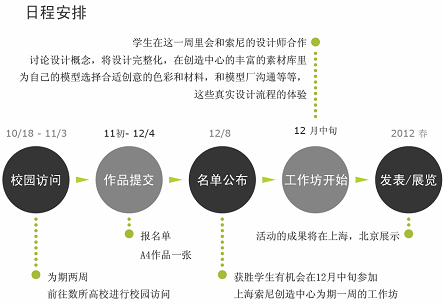 通过网络申请、专家评审选拔出来的工作坊成员将受索尼中国的邀请,在位于上海的索尼中国创造中心进行为期9天的的创造体验,在索尼资深产品设计师的帮助和指导下,实现自己为全球顶级品牌Sony设计的梦想。学生的作品还会在上海和北京两地展出,设计师将有机会亲自向参观者介绍设计理念。