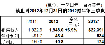 东京2013年2月7日 - 索尼集团今日宣布2012财年第三季度(2012年10月1日至2012年12月31日)综合业绩。
