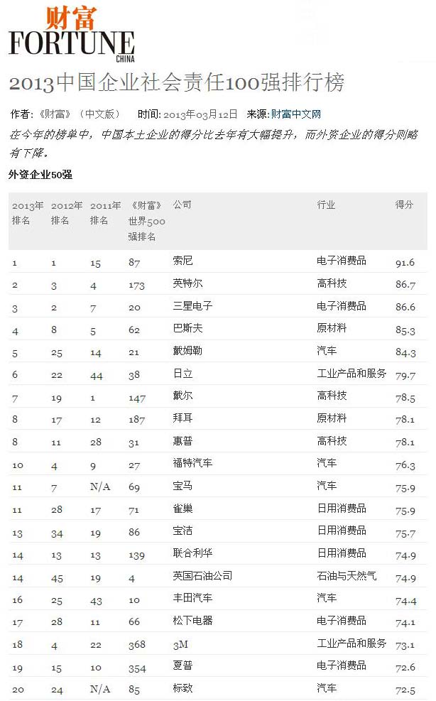 《财富》(中文版)于3月20日发布了2013年度企业社会责任排行榜,索尼公司在上榜的100家中外企业中得分最高,连续两年位居外资企业榜首,英特尔、三星电子分列第二、第三位。