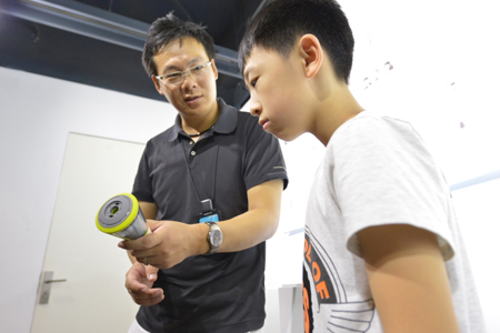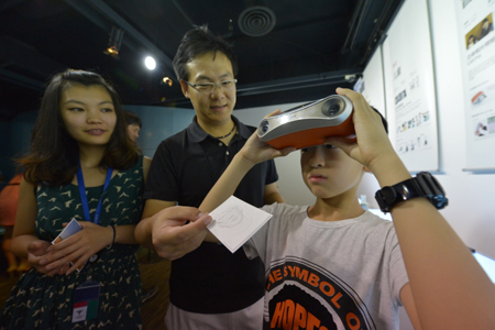 索尼创造中心资深产品设计师宋晓峰正在向孩子展示“全景视频电话”
