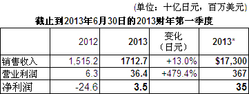 2013财年第一季度,索尼公司销售收入同比增长13%,为17,127亿日元(173亿美元)。销售收入增长的主要原因是:汇率利好影响,金融业务收入增长,以及智能手机销售台数增长。