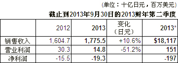 2013财年第二季度,索尼公司销售收入同比增长10.6%,为17,755亿日元(181亿美元)。销售收入增长的主要原因是:汇率利好影响,智能手机销售增长。