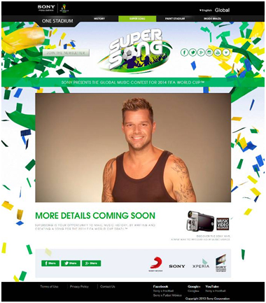 从2013年12月2日开始, 索尼和瑞奇•马丁热邀全球音乐人、乐迷和球迷,在www.supersong.com上传原创音乐视频及原创歌词,共同参与到2014年世界杯官方专辑的创作中。所有提交的原创音乐作品将会由“SuperSong”评审团进行评定,最终锁定20首歌曲入围,然后由索尼音乐娱乐专业人士和网络粉丝投票选出他们最喜欢的作品。瑞奇•马丁和“SuperSong”评审团将在入围作品中,选择最终的获胜者,并将于2014年2月宣布结果。获胜者将有幸前往波多黎各,与国际巨星瑞奇•马丁和优秀音乐制作人,共同录制完成由索尼音乐娱乐公司发行的2014国际足联世界杯官方专辑。获奖者可以邀请一位客人一起,在2014年7月世界杯决赛期间,作为索尼的贵客,共赴巴西观赛,获得索尼尊享大礼。