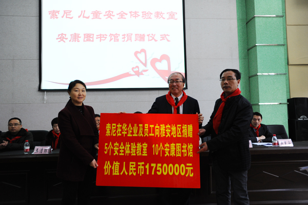 2013年12月11日,由索尼公司捐赠的索尼“安康图书馆”和“安全体验教室”正式落户四川雅安。今年4月,四川省雅安市芦山县发生7.0级地震后,索尼中国等索尼在华企业、投资机构、工厂及员工向雅安灾区捐款200万元人民币,为雅安中小学校捐建10个“索尼安康图书馆”及5个“索尼安全体验教室”,以改善灾区儿童的教学环境。同时,索尼公司将不仅从硬件上改善孩子们的学习环境,也将通过有特色的科普实验课、科普影片等,激发他们对科学的好奇心以及创造力,以“科技”助力,为孩子们的梦想注入正能量!